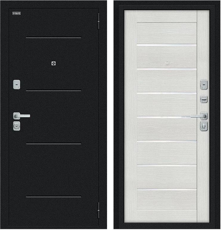 Надежная входная Дверь Браво Техно/BChrome Букле черное/Bianco Melinga премиум класса по цене 34 363 руб. Большая толщина стали защитит от проникновения в ваш дом, квартиру или коттедж. Используется очень качественная фурнитура: замки, цилиндры, ручки, защелки. Покрытие и отделка двери изготовлено под внимательным контролем производителя. Дверь имеет долгий срок службы и гарантию.