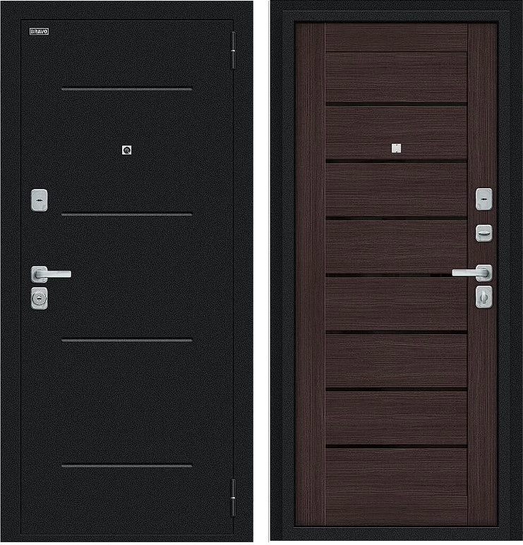 Надежная входная Дверь Браво Техно/BChrome Букле черное/Wenge Melinga премиум класса по цене 34 363 руб. Большая толщина стали защитит от проникновения в ваш дом, квартиру или коттедж. Используется очень качественная фурнитура: замки, цилиндры, ручки, защелки. Покрытие и отделка двери изготовлено под внимательным контролем производителя. Дверь имеет долгий срок службы и гарантию.